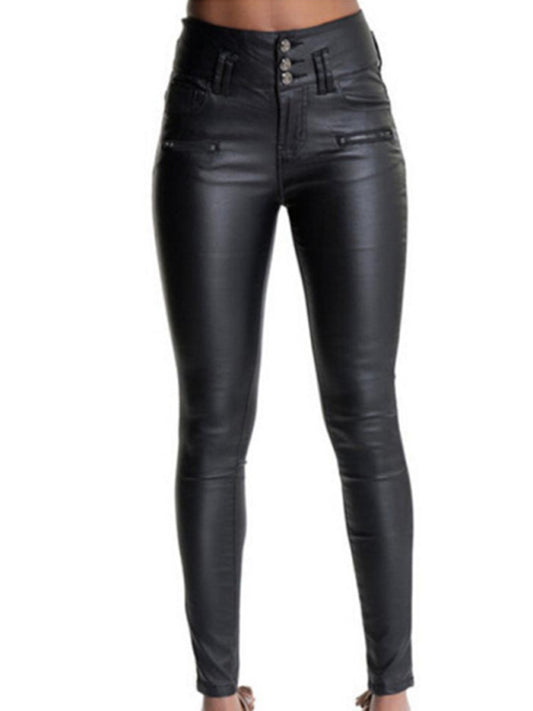 Women’s Faux Leather Exposed Button Closures At Front Belt Loops High Rise Skinny Pants
